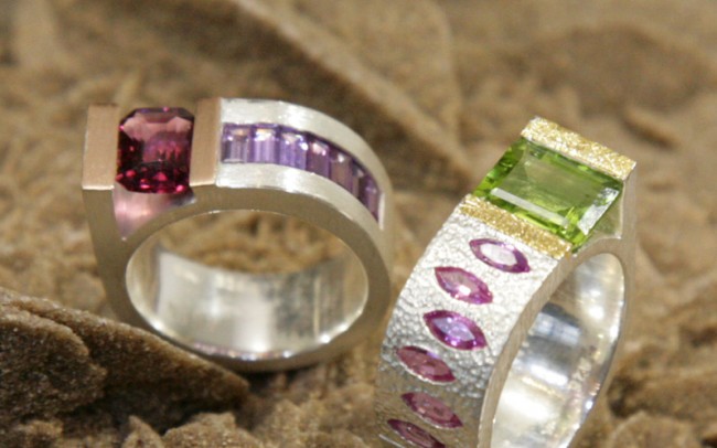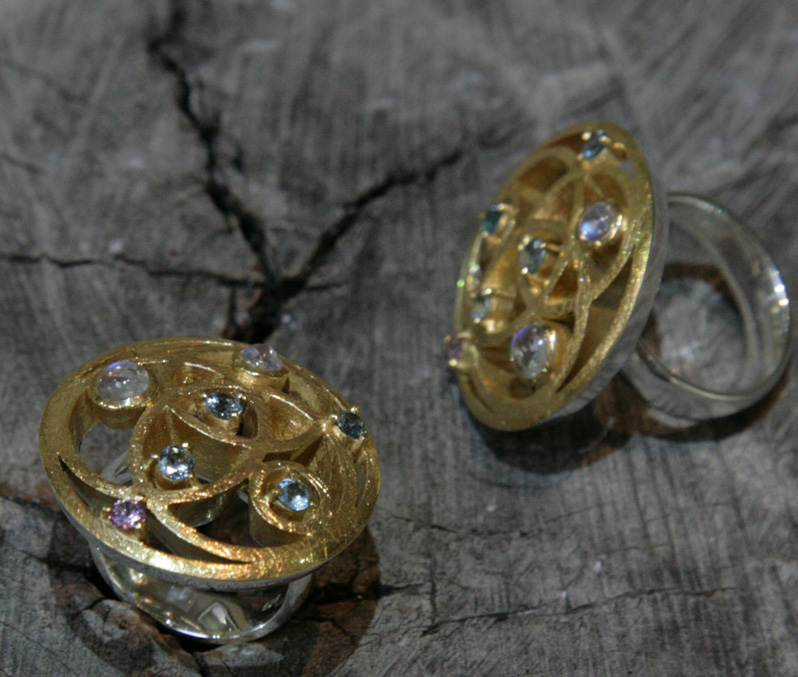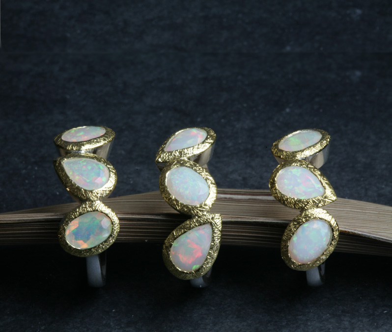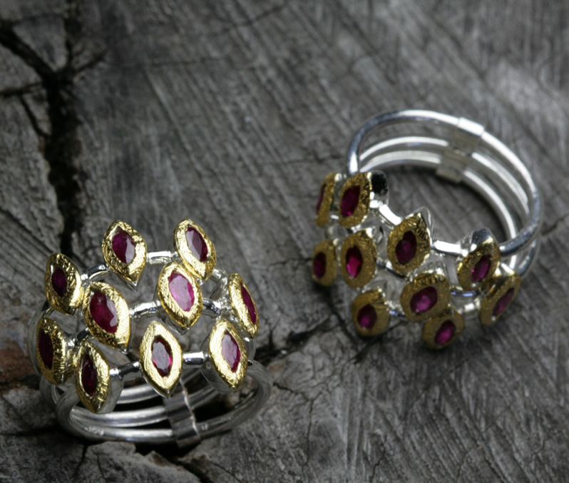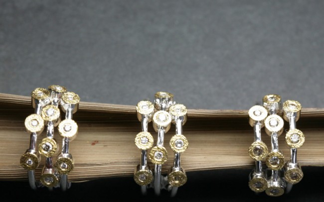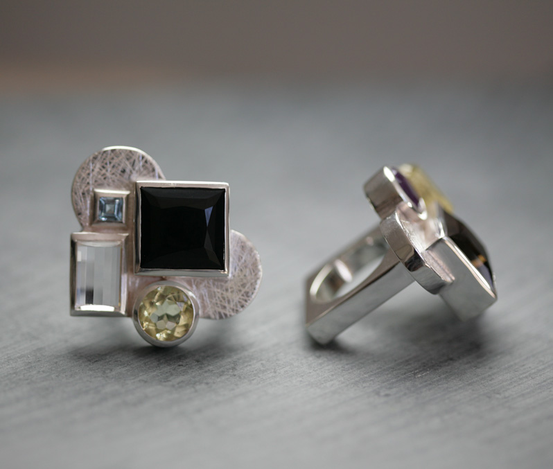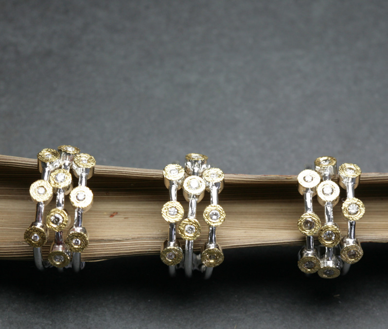 The ‘MOSAIC’ collection originates from our love to play with colours and shapes. It is all about finding new and exciting ways to arrange different gemstones and unusual materials to create interesting statement pieces of jewellery. Some of the designs are inspired by impressionism, pixelation or art deco. The jewellery pieces range from delicate designs with small diamonds or sapphires to rather chunky pieces with larger stones. Creating these designs is very time intensive, not only because one gets lost in the myriad of possibilities but more often because of the painstaking selection process of the correct gemstones.