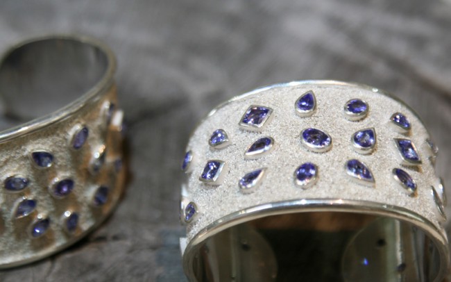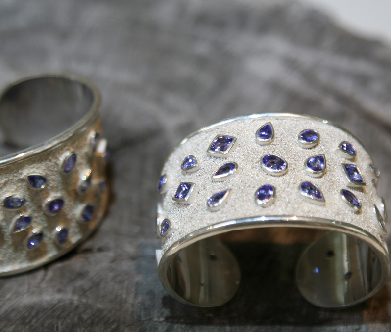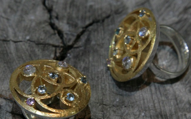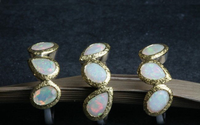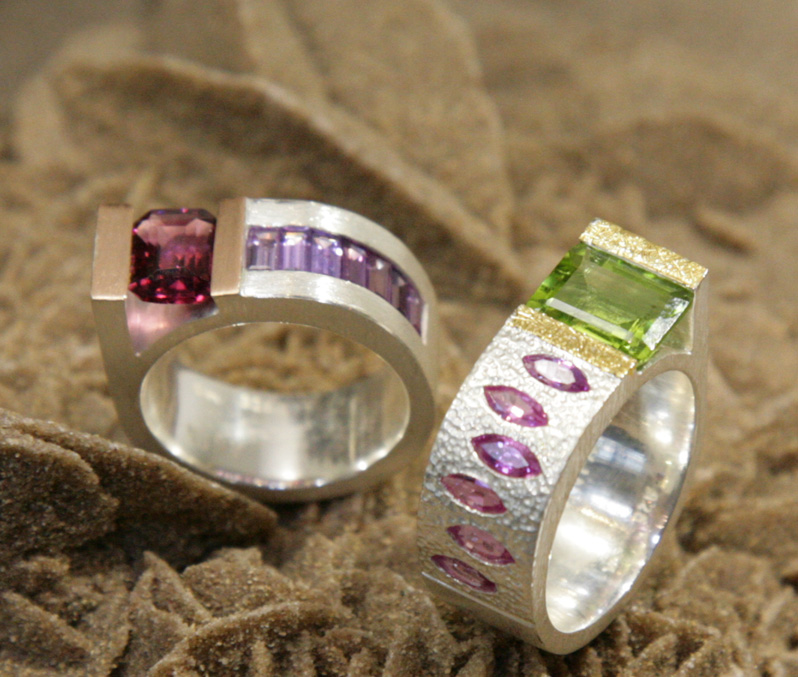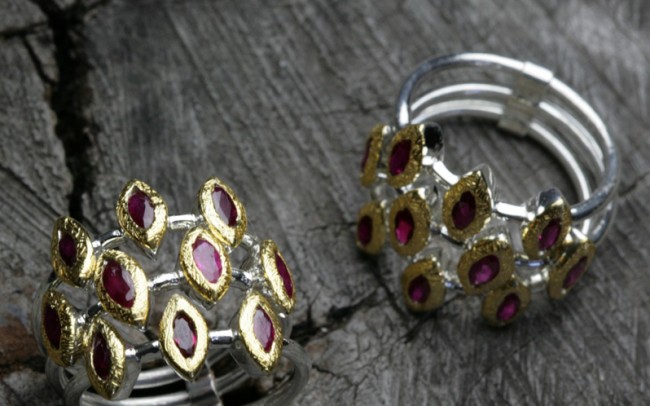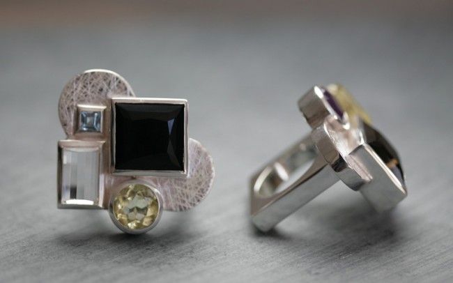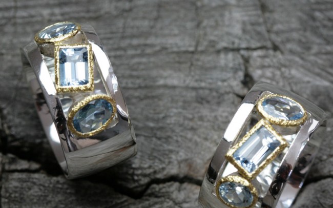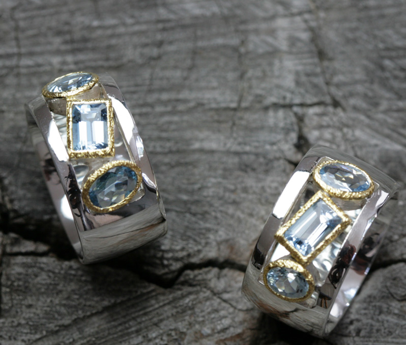 The ‘MOSAIC’ collection originates from our love to play with colours and shapes. It is all about finding new and exciting ways to arrange different gemstones and unusual materials to create interesting statement pieces of jewellery. Some of the designs are inspired by impressionism, pixelation or art deco. The jewellery pieces range from delicate designs with small diamonds or sapphires to rather chunky pieces with larger stones. Creating these designs is very time intensive, not only because one gets lost in the myriad of possibilities but more often because of the painstaking selection process of the correct gemstones.